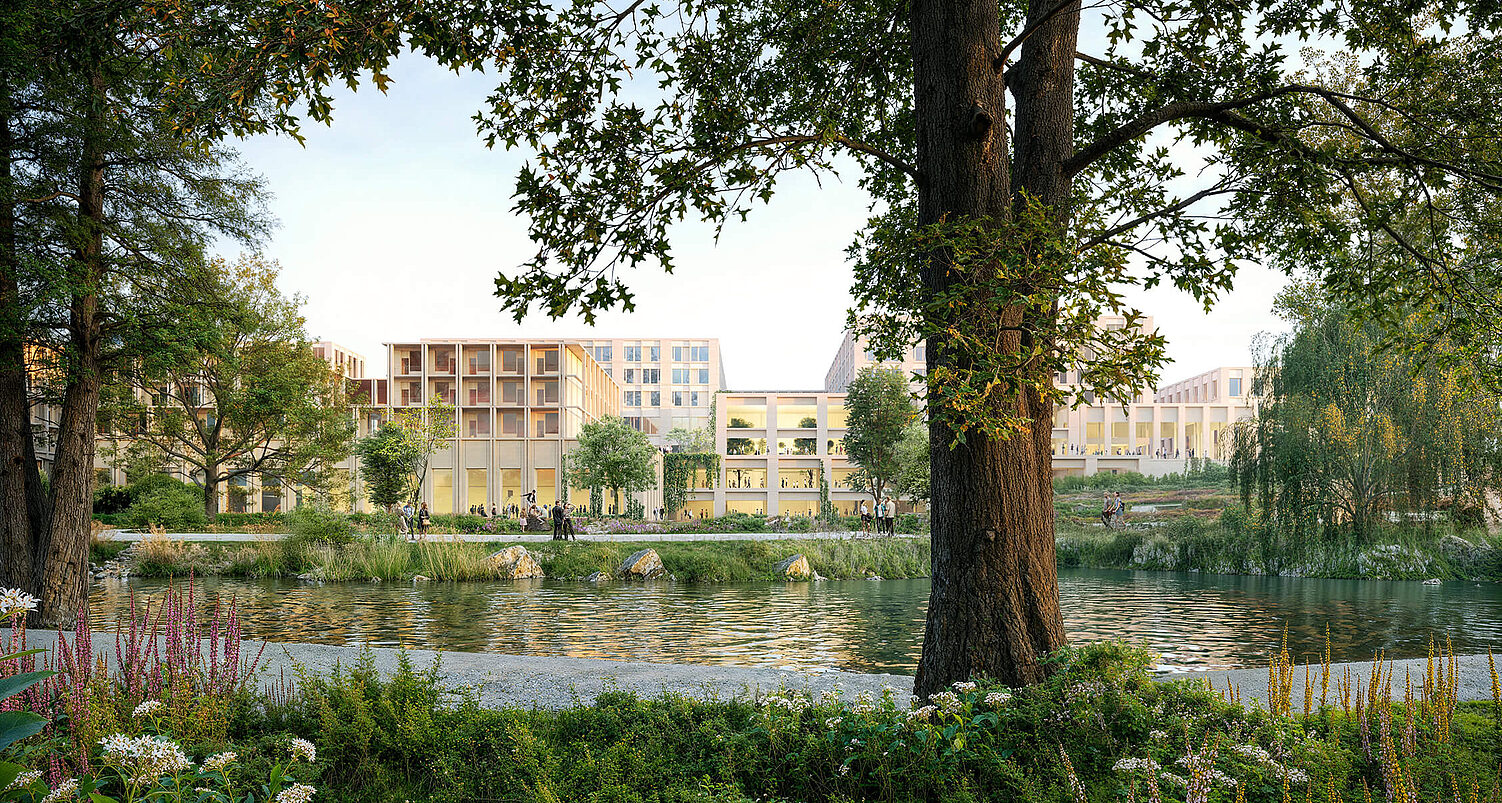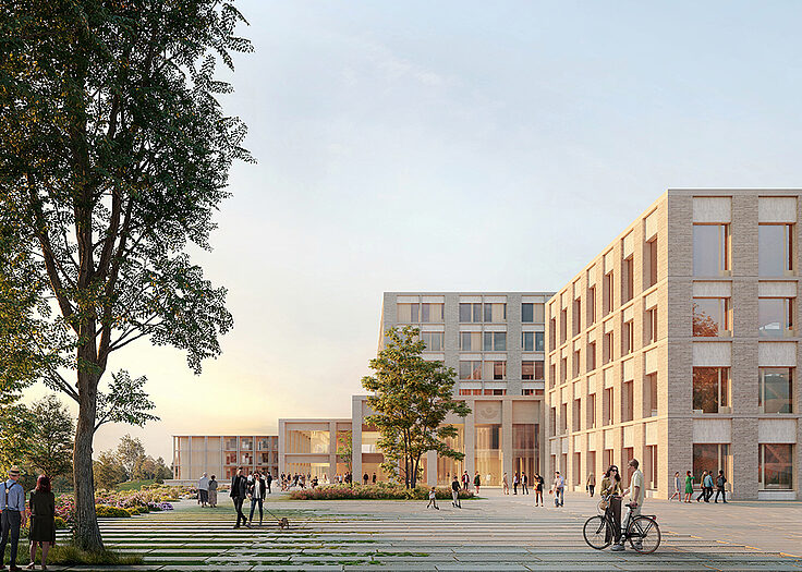 Unser Konzept für den modernen Krankenhausbau übersetzt große Maßstäbe in eine menschenorientierte Architektur. Entlang der Bergedorfer Straße entsteht durch eine differenzierte Staffelung der Baukörper eine klare städtebauliche Kante mit angenehmer Maßstäblichkeit. Klinkerfassaden, Begrünung und variierende Gebäudehöhen erzeugen Identität und Rhythmus im urbanen Raum. Zur Parkseite hin öffnen sich die Gebäude mit warmen Holzfassaden und fließenden Übergängen in die Landschaft – ein zentrales Element nachhaltiger Gesundheitsarchitektur.