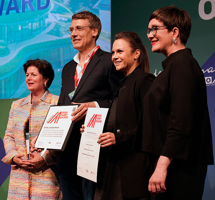 At Baumschlager Eberle Architekten, climate protection is also a top priority in professional life. The managing directors of the Vienna office - Julia Wildfeuer and Jakob Pesendorfer - therefore represented the heads of the Paris office, Anne Speicher and Mathias Bernhardt, at the Austrian Green Planet Building Award (AGPB) ceremony in the Vienna Chamber of Commerce. Astrid Fixl-Pummer (Austrian Foreign Trade) and Henriette Spyra, MA (Climate Ministry) recently presented the certificate to our managers.