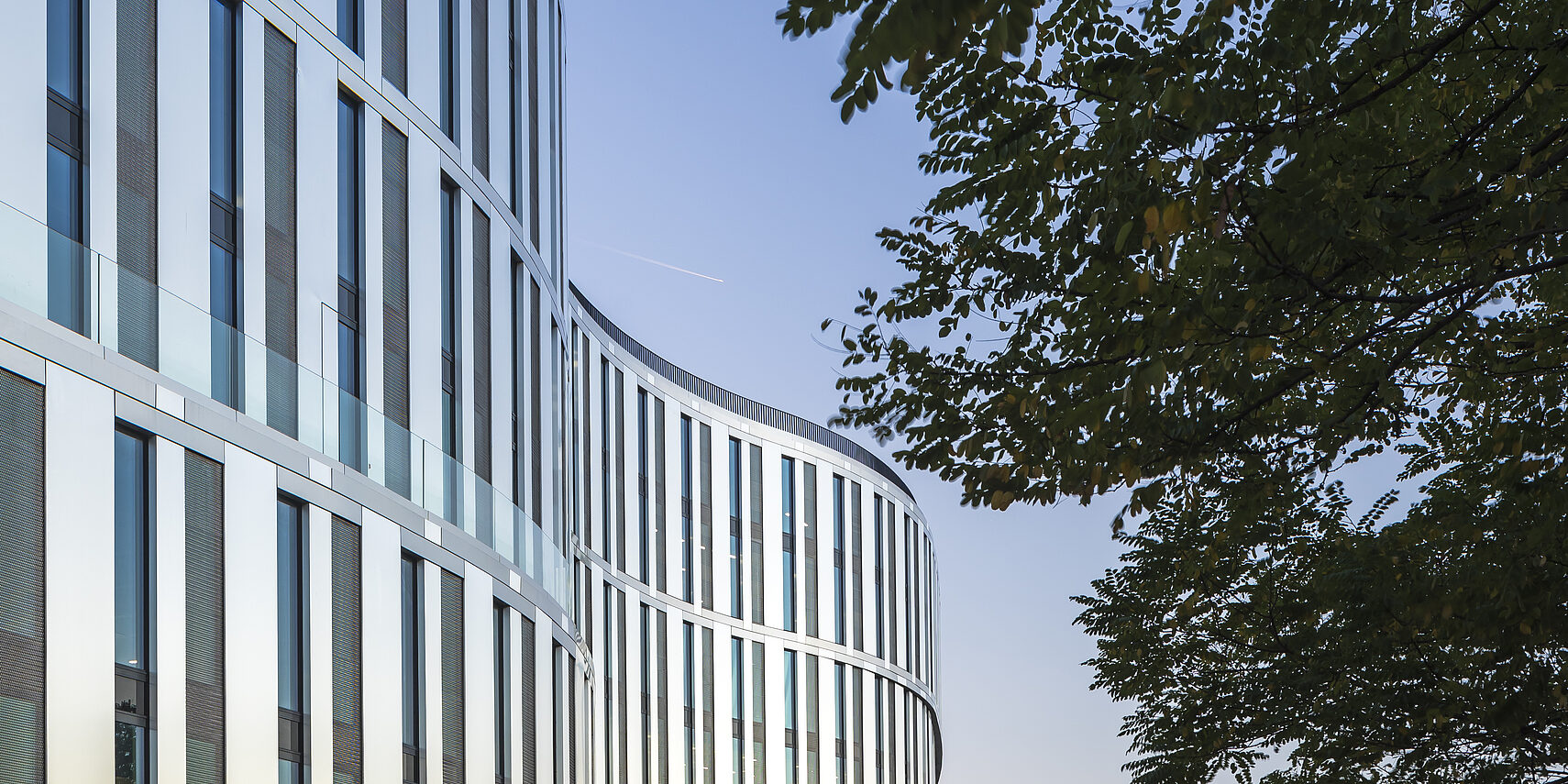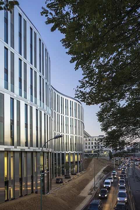 Im Außenbereich erzeugt das Spiel aus gläsernen Fassaden und metallischen Elementen eine nahezu vibrierende Oberfläche, deren Wirkung sich über den Tag und mit dem Sonnenstand verändert. Die Stadt und der Verkehr auf der angrenzenden Autobahn fügen dem noch ihr eigenes Farbenspiel hinzu. Ein grafischer und ästhetischer Effekt, der durch die scheinbare Bewegung der Gebäude-„Flügel“ zusätzlich verstärkt wird. Das Dach ist mit leicht geneigten Photovoltaik-Modulen bestückt; auch dies trägt zum dynamischen Charakter des Gebäudes bei.