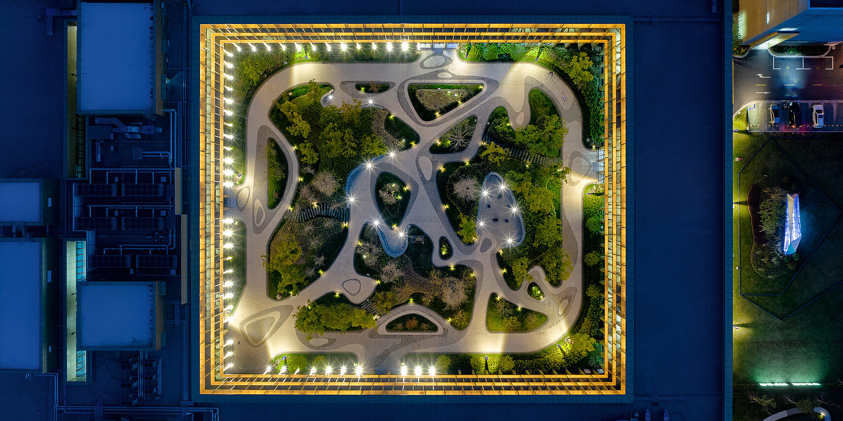 Mit drei bzw. vier Etagen ist die Höhe der alten Fabrik geblieben. Zu dieser Höhe wurden Breite und Länge des Hofes in Relation gesetzt, was zu idealen Proportionen und einer wohltuenden Atmosphäre führte. Die stilisierte, gleichsam künstliche Landschaft mit Bäumen, ausgesuchten Pflanzen und Wegen hat etwas Märchenhaftes. Zudem finden im Innenhof Konzerte und andere Aktivitäten statt.